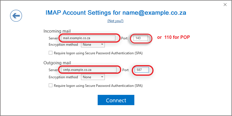 - Incoming mail: add mail. before your domain name e.g. mail.example.co.za